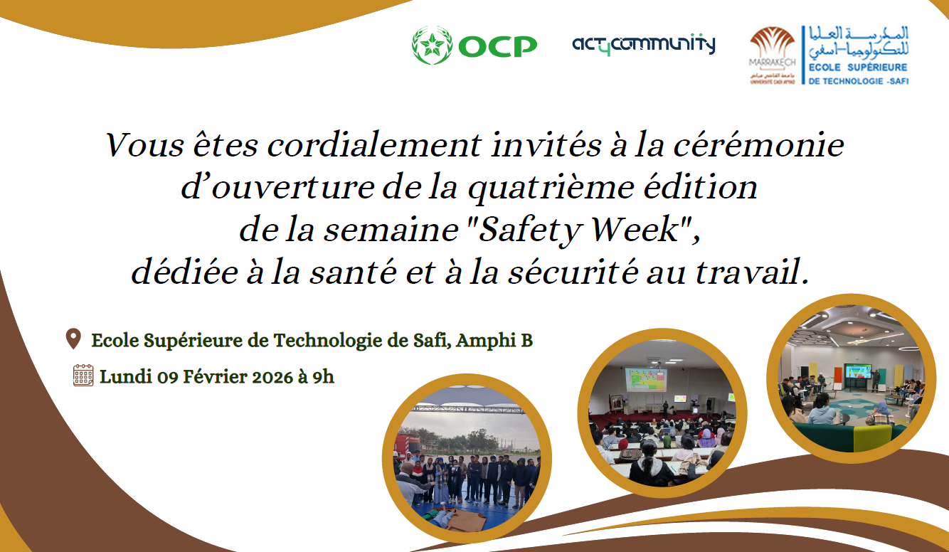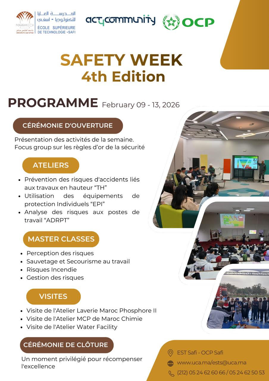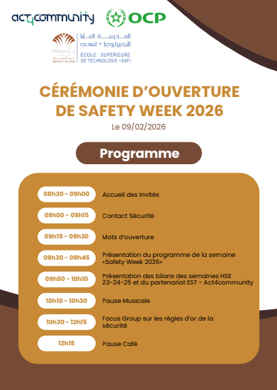 Du 09 au 13 février 2026 à l’EST Safi et les sites de l’OCP sur l’hygiène, la sécurité et l’environnement (HSE). Le programme de la formation est affiché ci-joint |